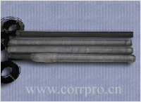 石墨是一種耐蝕材料,作為輔助陽極使用時屬低溶性陽極材料,石墨陽極可用于土壤、流動海水和海泥中。實際上它們是不會遭受氯破壞的。石墨陽極通常用封閉劑浸漬,以防止由于孔洞中析氣而引起機械損傷,石墨也是脆性的,在海水中,他的消耗是0.45kg/A.a(11b/A.a);在填料中為0.9 kg/A.a(21b/A.a);在海泥中1.36kg/A.a(31b/A.a)。石墨陽極往往以柱形陽極生產.
