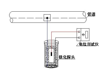3、 把極化探頭測試電纜中的黃色測試電纜和被測構(gòu)筑物相連接,用電位測試儀正端接紅色測試線、負端接黑色測試線。此時電位測試儀屏幕上所顯示的電位值就是目前被測構(gòu)筑物上的實際電位值。